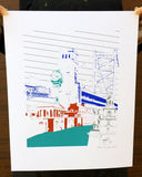 Ben Franklin Bridge card is a 2-color letterpress printed card with a hand illustration of the bridge with a circle pattern in the background. A short blurb on the history of the bridge is on the back of the card.